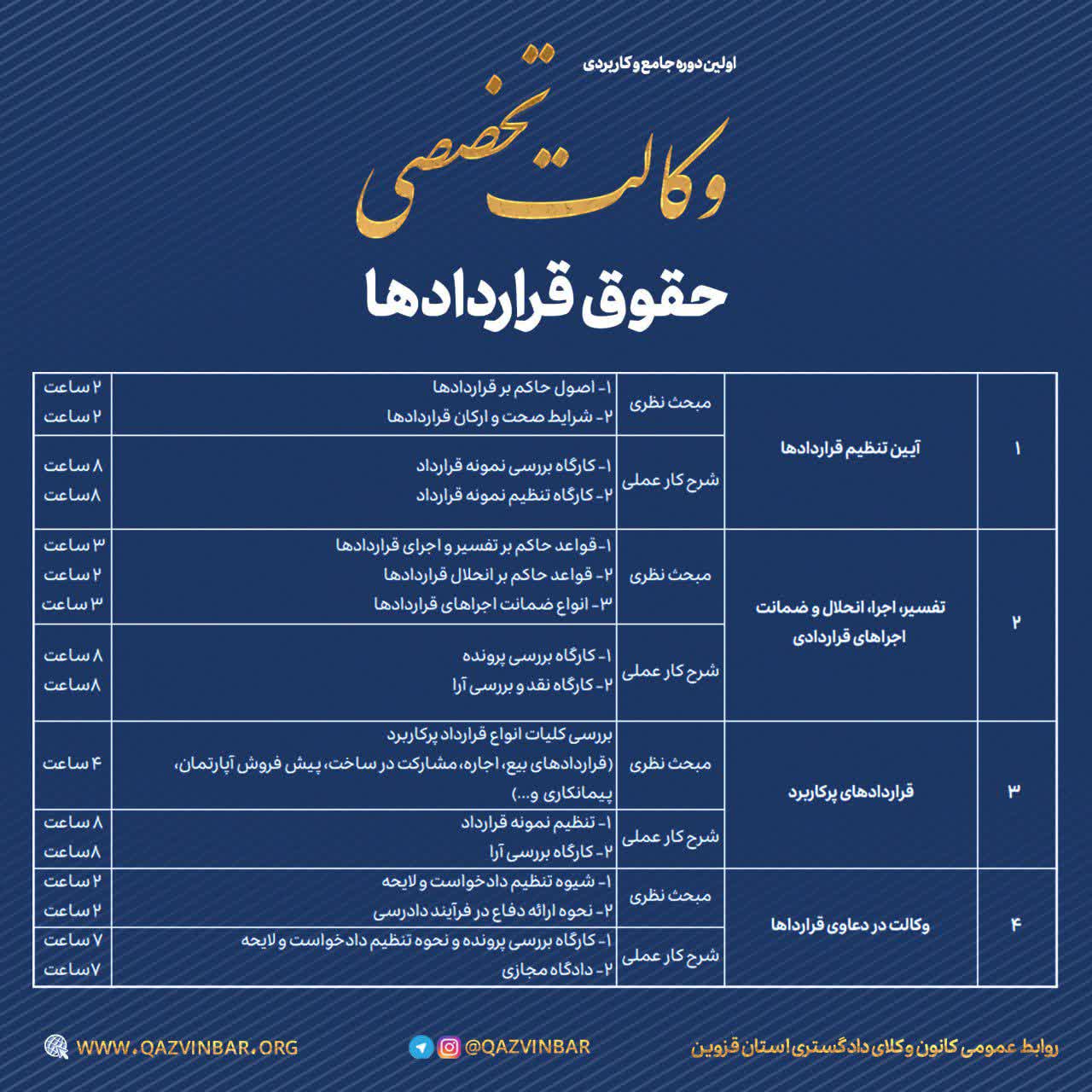 رئیس دانشگاه جامع علمی کاربردی استان قزوین با بیان اینکه در این دوره به تشریح آیین تنظیم قراردادها، تفسیر، اجرا، ضمانت و انحلال قراردادها، قراردادهای پرکاربرد و وکالت در دعاوی قراردادها پرداخته میشود، اظهار داشت: مهلت ثبتنام در این دوره پایان ساعت اداری روز چهارشنبه ۱۷ مردادماه میباشد و در برنامهریزی زمان برگزاری آن به مشغله کاری وکلا توجه شده لذا دوره در روزهای پنجشنبه به صورت دو شیفت صبح و عصر برگزار میشود.