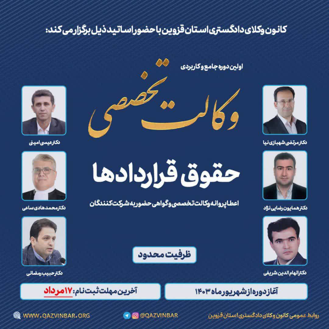 به گزارش روابط عمومی دانشگاه جامع علمی کاربردی استان قزوین، دکتر دوسرانیان مقدم با اعلام این خبر، جامعه هدف این دوره را وکلای دادگستری با حداقل 3 سال سابقه کاری عنوان کرد و افزود: دوره آموزش تخصصی حقوق قراردادها در شهریورماه سال جاری به مدت 82 ساعت توسط کانون وکلای دادگستری استان برگزار خواهد شد و در پایان دوره به شرکتکنندگان پروانه وکالت تخصصی اعطاء خواهد شد.